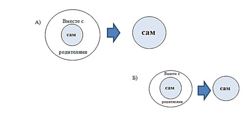 Сам – это зона того, что ребёнок может сделать без вас, что он понимает и знает. Здесь же и то, чего он хочет, но для чего пока не хватает знаний, умений, навыков. Вместе с родителями – зона вашей компетенции, то, в чем мы можете помочь, научить, объяснить. Зона, в которой вы что-то делаете вместе (не за ребёнка). Из сравнения схем А и Б следует, что чем больше вы участвуете в развитии ребёнка, тем быстрее он развивается и тем больше становится его «САМ». Делайте выводы.